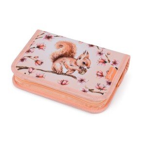 Dvouchlopňový penál s roztomilou veverkou pro malé školačky. Přehledné uspořádání, dostatek místa na pomůcky a praktické detaily pro každý školní den.