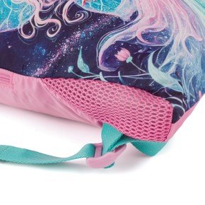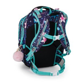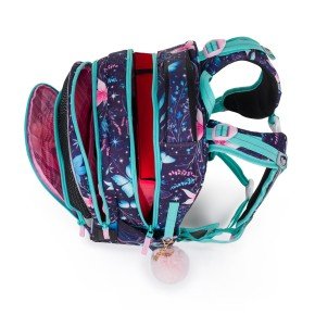 Elegantní batoh s vílou pro malé slečny od 1. do 3. třídy s třpytivým designem. Váží pouze 0,94 kg, přesto je prostorný. Má tři velké komory a organizér na mobil, peněženku i další cennosti. Stojí na plastových nožkách, ve tmě svítí reflexními prvky. Výbavu pro malou princeznu doplňuje penál, látkový vak a sladěný svačinový set.