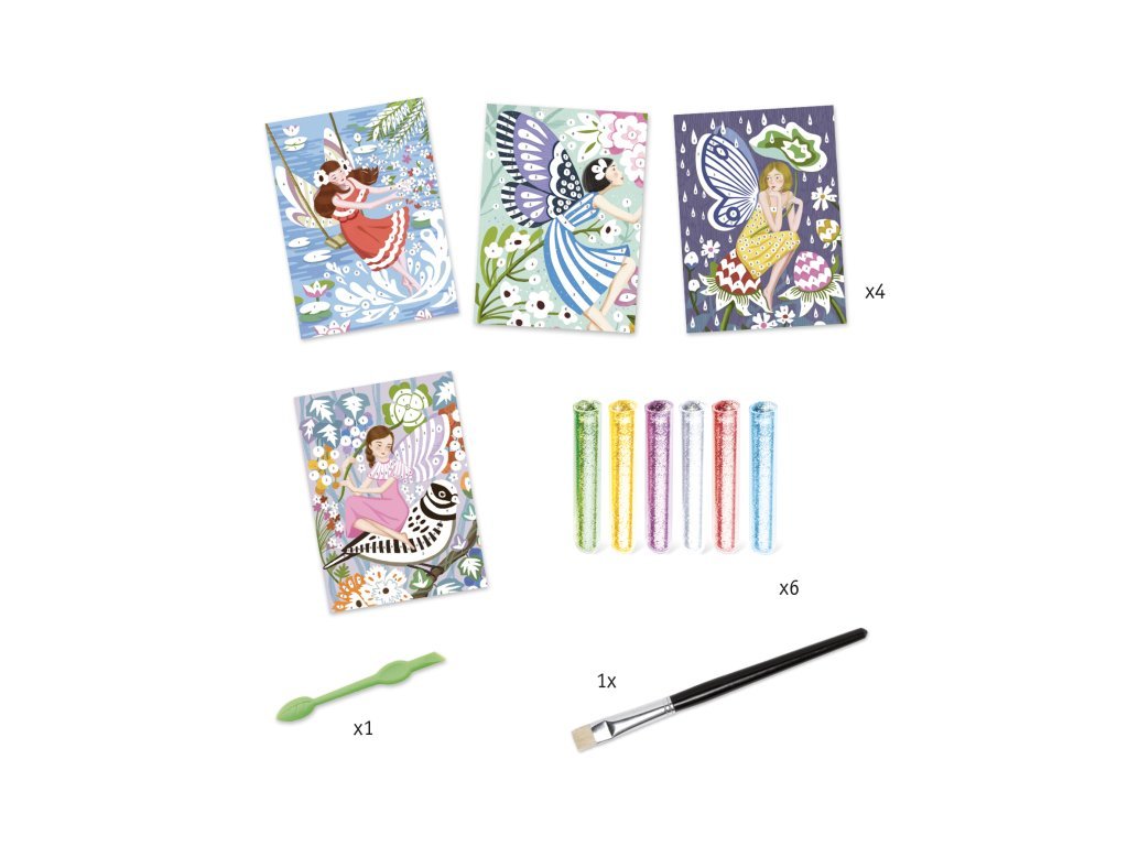 Sada Djeco přináší kouzelné tvoření s třpytkami. Děti si postupně odlepují jednotlivé části obrázku, posypou je barevnými třpytkami a sledují, jak se obrázky kouzelných víl proměňují v oslnivá umělecká díla. Díky snadnému postupu a přiloženému návodu zvládnou tvoření hravě i mladší děti. Výsledkem jsou nádherně lesklé obrázky, které mohou ozdobit pokojíček nebo potěšit jako dárek.