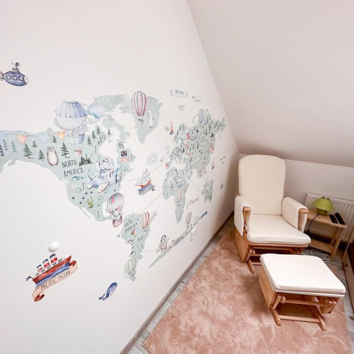 Mapa světa na zeď pro děti – samolepka INSPIO na zeď v hravém dětském provedení s balóny, letadly a zvířátky v neutrální barvě.