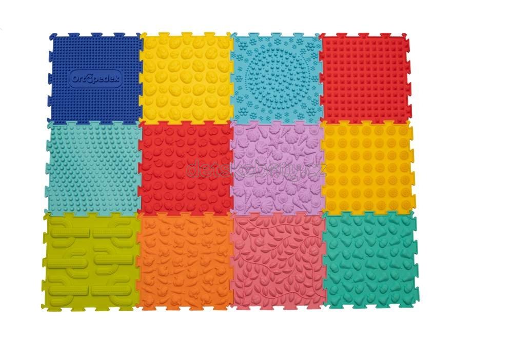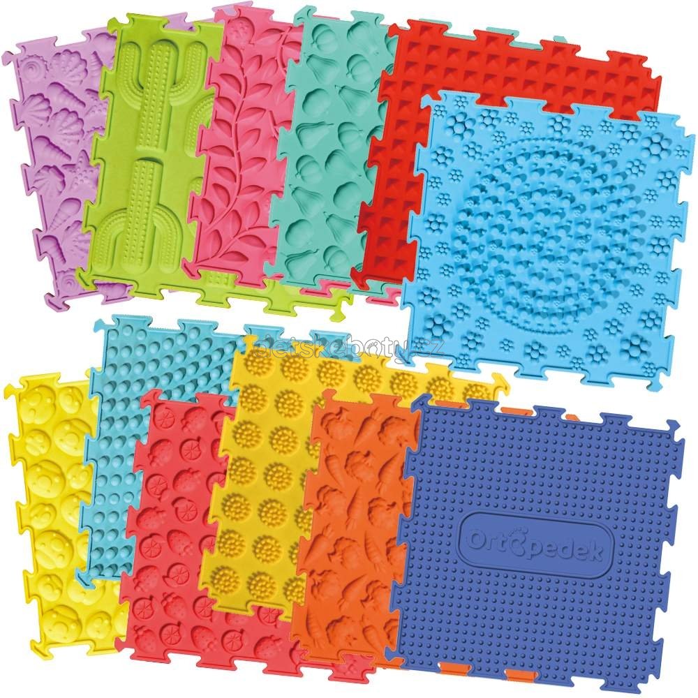 Tato velká sada obsahuje dvanáct barevných silikonových podložek, které dohromady tvoří ten nejrozmanitější masážní a cvičební chodníček pro zdravý vývoj dětských nohou. Každý z dvanácti dílků má svůj unikátní vzor, který děti okamžitě vtáhne do hry – těšit se mohou na modré spirály, červené jahůdky, zelené kaktusy, fialové mušle, žlutá kolečka, světle zelené dýně, tyrkysové výstupky, červené pyramidy, růžové berušky, žluté hříbky, oranžové mrkvičky a modré ortopedické výstupky.