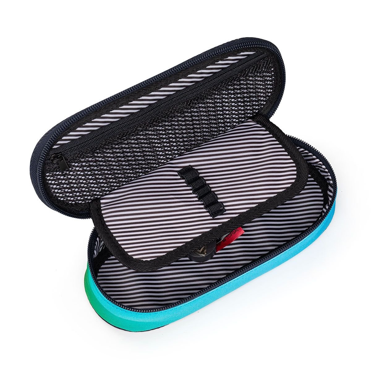 Oválný penál pro všechny starší školáky a studenty. Uvnitř pouzdra je síťová kapsička na zip a klopa. Na ní jsou umístěny gumičky pro uchycení celkem devíti tužek a propisek, které je potřeba mít přehledně uspořádané a po ruce. Volný prostor pod klopou slouží pro další psací potřeby – pastelky, fixy, ale i pravítko nebo kružítko.