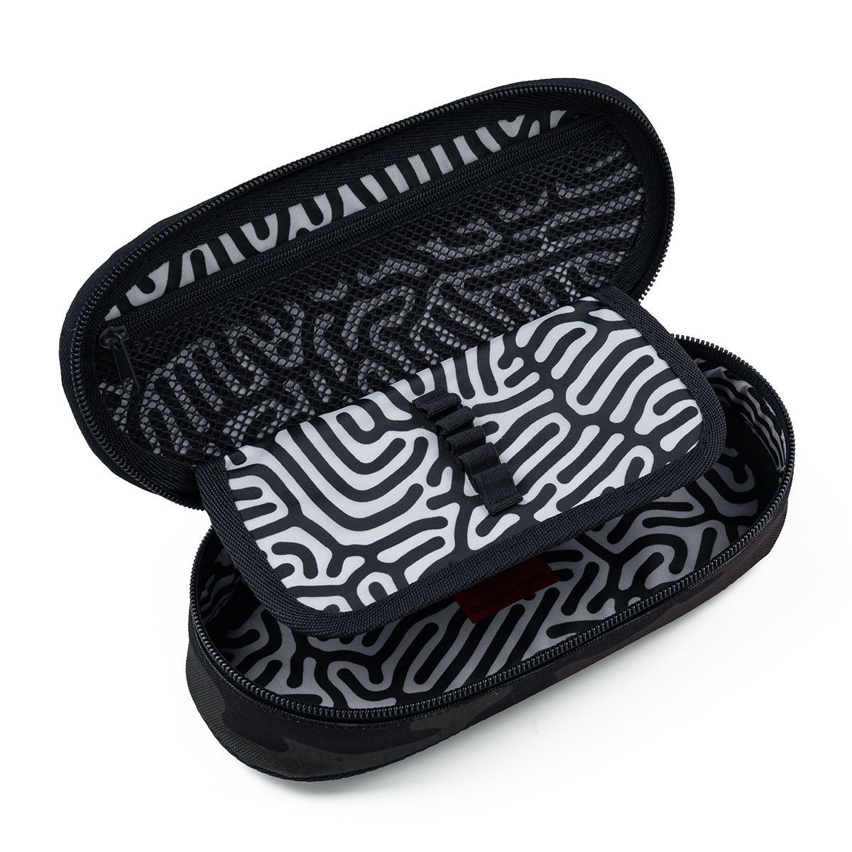 Oválný penál pro všechny starší školáky a studenty. Uvnitř pouzdra je síťová kapsička na zip a klopa. Na ní jsou umístěny gumičky pro uchycení celkem devíti tužek a propisek, které je potřeba mít přehledně uspořádané a po ruce. Volný prostor pod klopou slouží pro další psací potřeby – pastelky, fixy, ale i pravítko nebo kružítko.