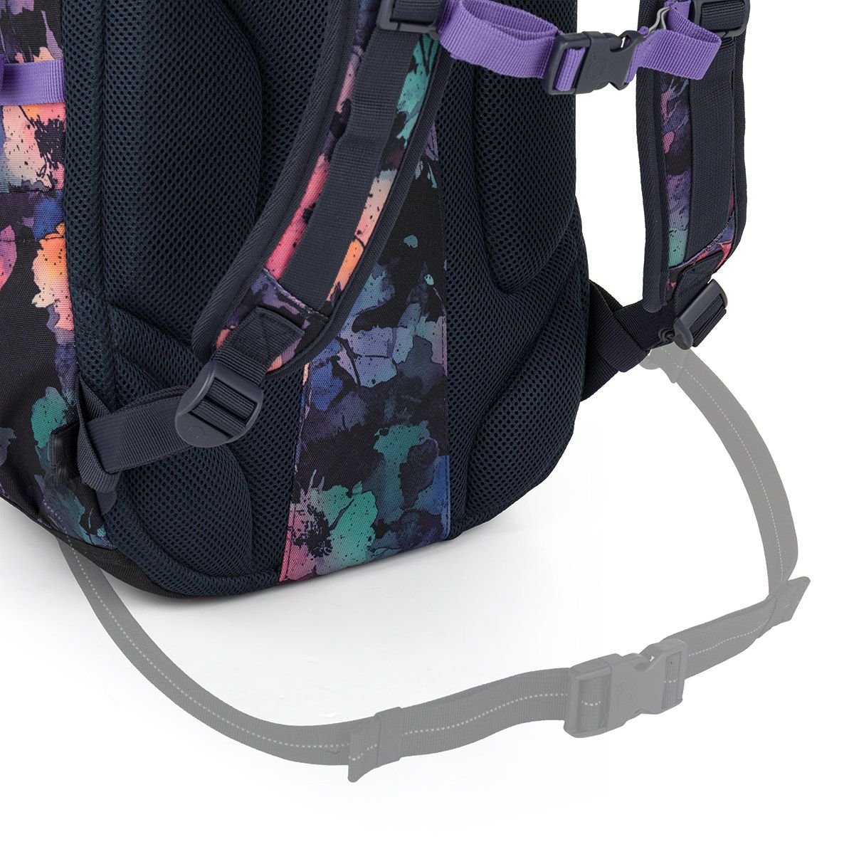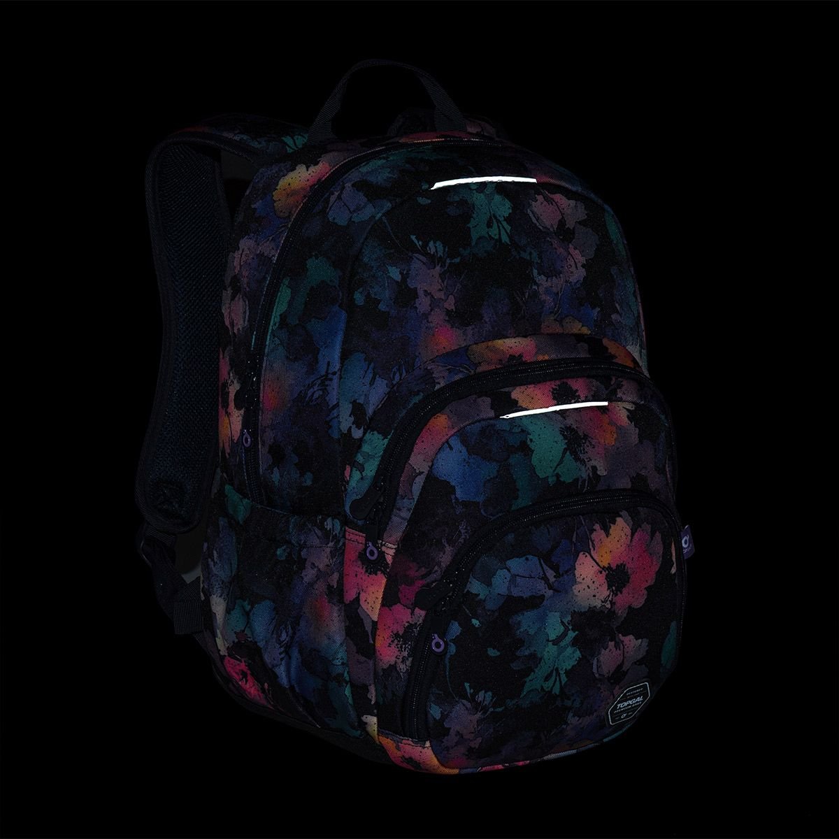 Jednokomorový batoh s pestrobarevným abstraktním motivem rozkvetlých květin na černém podkladu. Záda batohu jsou polstrovaná a anatomicky tvarovaná z měkké pěny. Uvnitř zadní komory je umístěna polstrovaná kapsa na notebook i tablet.