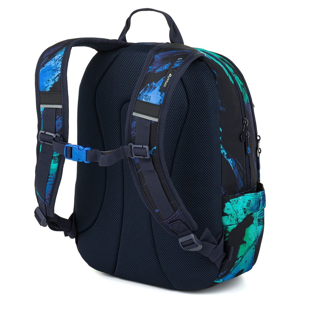 Dvoukomorový batoh s moderním abstraktním motivem v sytých odstínech modré a tyrkysově zelené na černém podkladu. Záda batohu jsou polstrovaná a anatomicky tvarovaná z měkké pěny. Uvnitř zadní komory je umístěna polstrovaná kapsa na notebook i tablet.