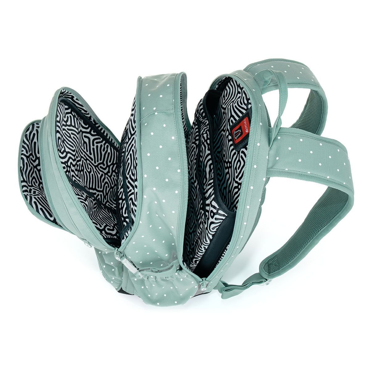 Objemný dvoukomorový batoh s puntíky a stylovou nášivkou si získá každou dospívající slečnu, která chce vyniknout. Záda batohu jsou polstrovaná, anatomicky tvarovaná a pevná díky lehké hliníkové výztuze. Uvnitř zadní komory je umístěna polstrovaná kapsa na notebook i tablet a druhá menší na mobil či powerbanku.
