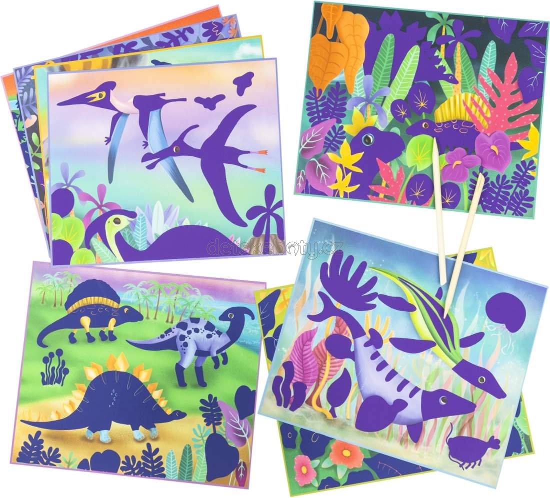 Vstupte do světa dinosaurů, kde vás čeká spoustu dobrodružství. Uvnitř se skrývají krásné ilustrované obrázky. Pomocí přiloženého dřevěného nástroje seškrábejte jejich části a odhalte zářivé odstíny a další krásné ilustrace.